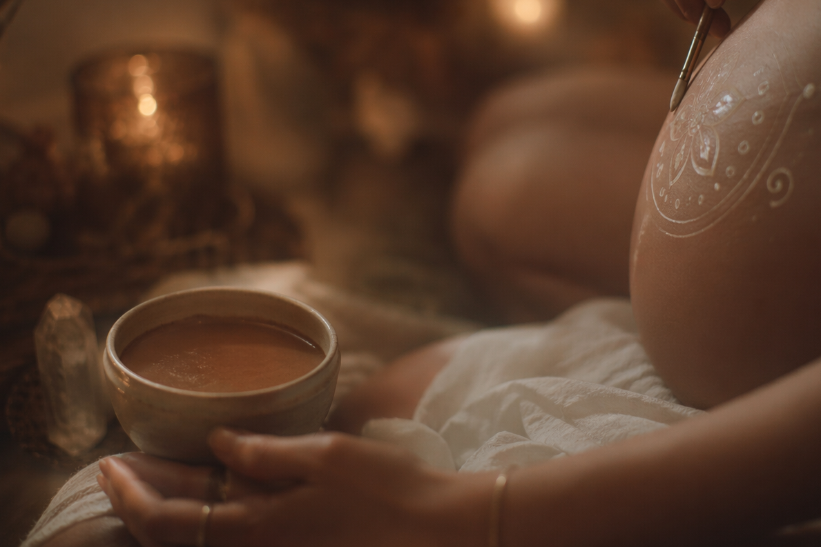 Together we will open the heart with cacao, weave flowers into crowns, mark the belly in reverence, and lay prayers into water for mother and child.